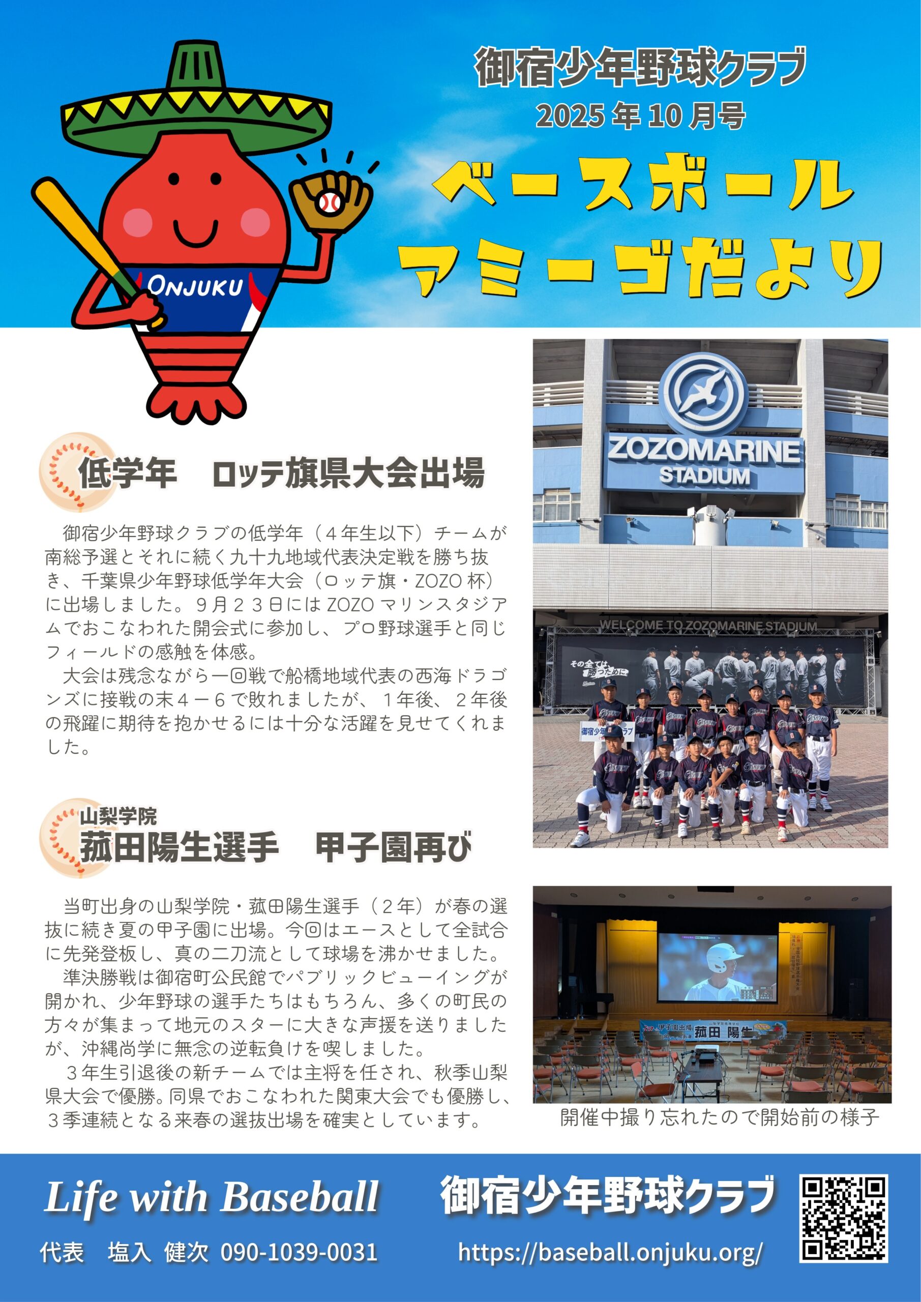 ベースボールアミーゴだより 2025.10 ニュース 2025.11.11 久しぶりの低学年ロッテ旗県大会出場!そして菰田陽生の甲子園出場にともなうパブリックビューイング開催など、今回も元気が出るニュースをお届けします。 PDF版ダウンロード